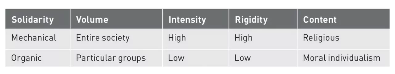In The Rules of Sociological Method ([1895] 1982), Durkheim differentiated between two types of social facts— material and nonmaterial. Although he dealt with both in the course of his work, his main focus was on nonmaterial social facts (for example, culture and social institutions) rather than material social facts (for example, bureaucracy and law). This concern for nonmaterial social facts was already clear in his earliest major work, The Division of Labor in Society ([1893] 1964). His focus there was a comparative analysis of what held society together in the primitive and modern cases. He concluded that earlier societies were held together primarily by nonmaterial social facts, specifically, a strongly held common morality, or what he called a strong collective conscience. However, because of the complexities of modern society, there had been a decline in the strength of the collective conscience. The primary bond in the modern world was an intricate division of labor, which tied people to others in dependency relationships.