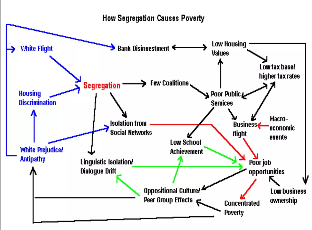 1. Moderate to high levels of black/white racial segregation, and somewhat lower but still substantial Hispanic/white segregation, are the norm for major U.S. metropolitan regions. 2. Moderately to highly segregated black and Hispanic neighborhoods are almost always markedly poor, and poorer than most of the overwhelmingly white neighborhoods in their metro region. This raises a question: are segregated black and Hispanic neighborhoods poorer simply because their inhabitants happen to be poor, or does racial segregation cause the poverty of their inhabitants? The model below shows that, while hardly the only factor, racial segregation is a major cause of systematic economic disadvantage for blacks. By parallel reasoning, it is probably also a significant cause of disadvantage for Hispanics, although empirical evidence on this point is not as extensive as in the case of blacks. Note that many of the factors below affect middle-class, not just poor, residents of segregated neighborhoods. Middle-class status, as measured by family income, occupation, or education, therefore does not confer the same economic advantages on segregated blacks as on whites.