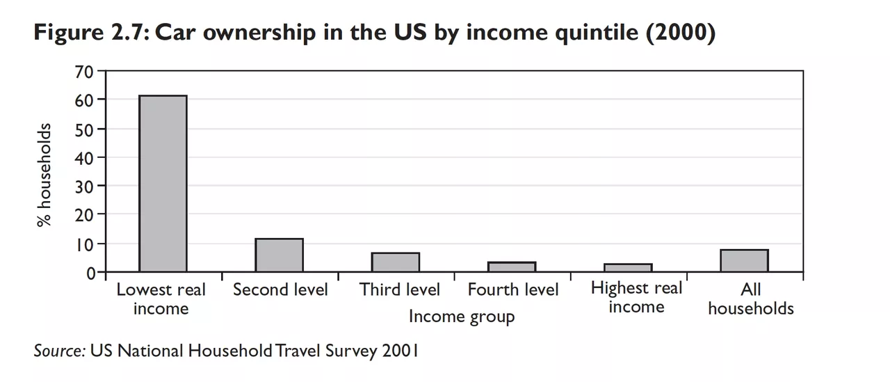 In 2001, 61% of households in the lowest income category in the US did not have access to a vehicle. This would suggest that, in most instances, non-car ownership is usually not a choice but rather based upon affordability and/or an inability to drive.